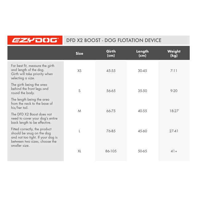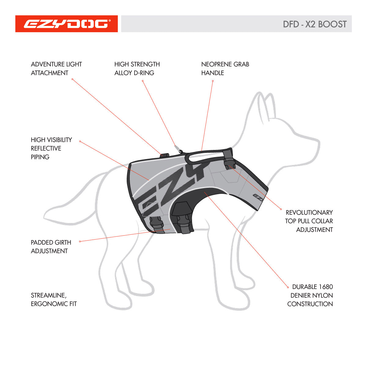 The EzyDog DFD X2 Boost is the second generation of EzyDog’s best selling dog life jacket, the DFD. This new design offers the same amount of floatation, with a more streamlined ergonomic fit. Whether you're teaching your dog to swim or simply using it as a safety precaution, the DFD X2 Boost will help your dog stay safe around water.