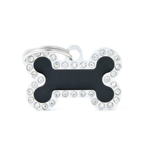 The Glam Bone Pet ID Tag is made of bronze, hand enamelled and adorned with shining strass (imitation gemstones). Each tag is a little jewel, made with hypoallergenic materials.