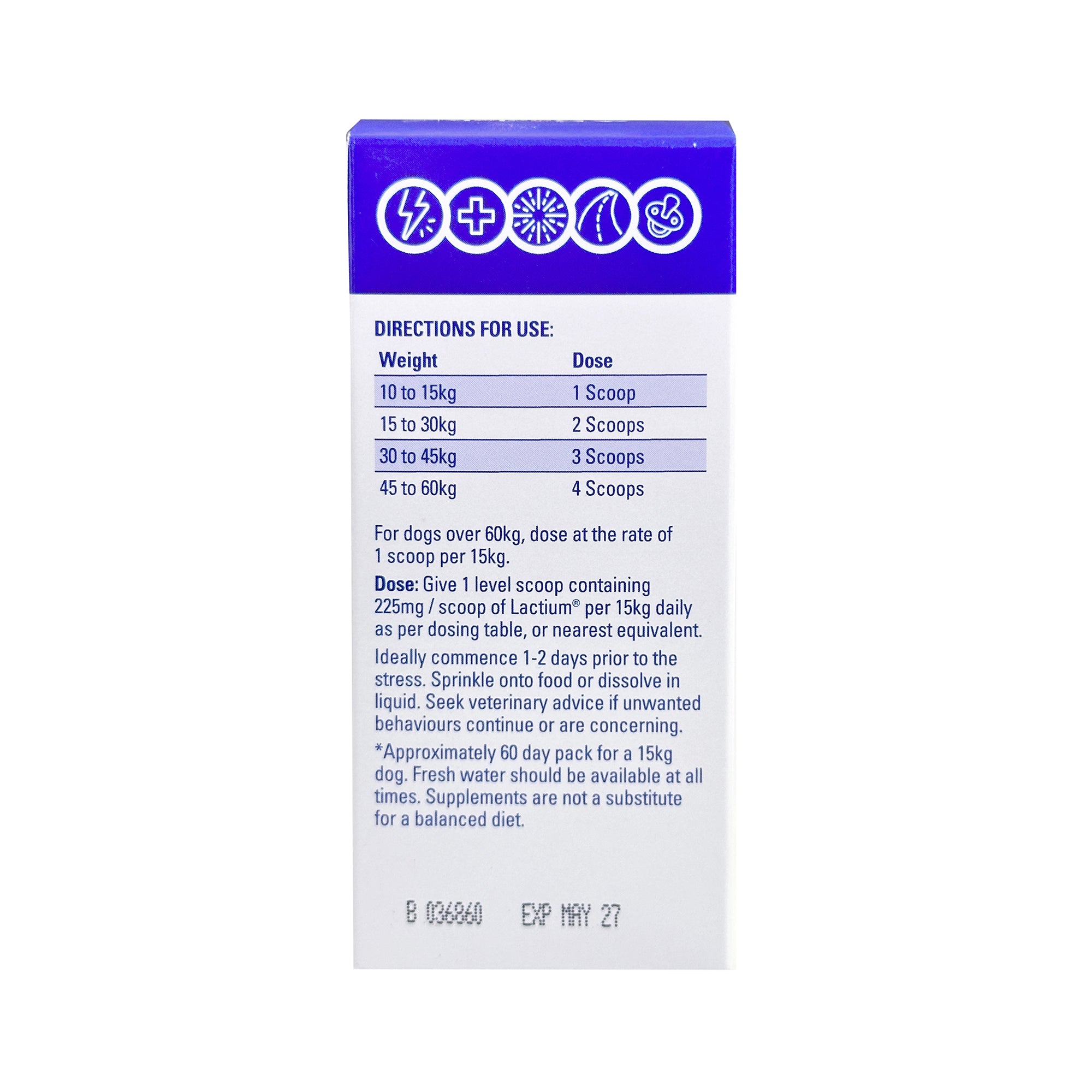 Dosing can commence 1-2 days prior to the stressful event & it can be given for longer periods if required for prolonged or recurring challenges, such as pets being left alone regularly during the working / school week. The below dose rates will provide 15mg of lactium® per kg bodyweight (bw).