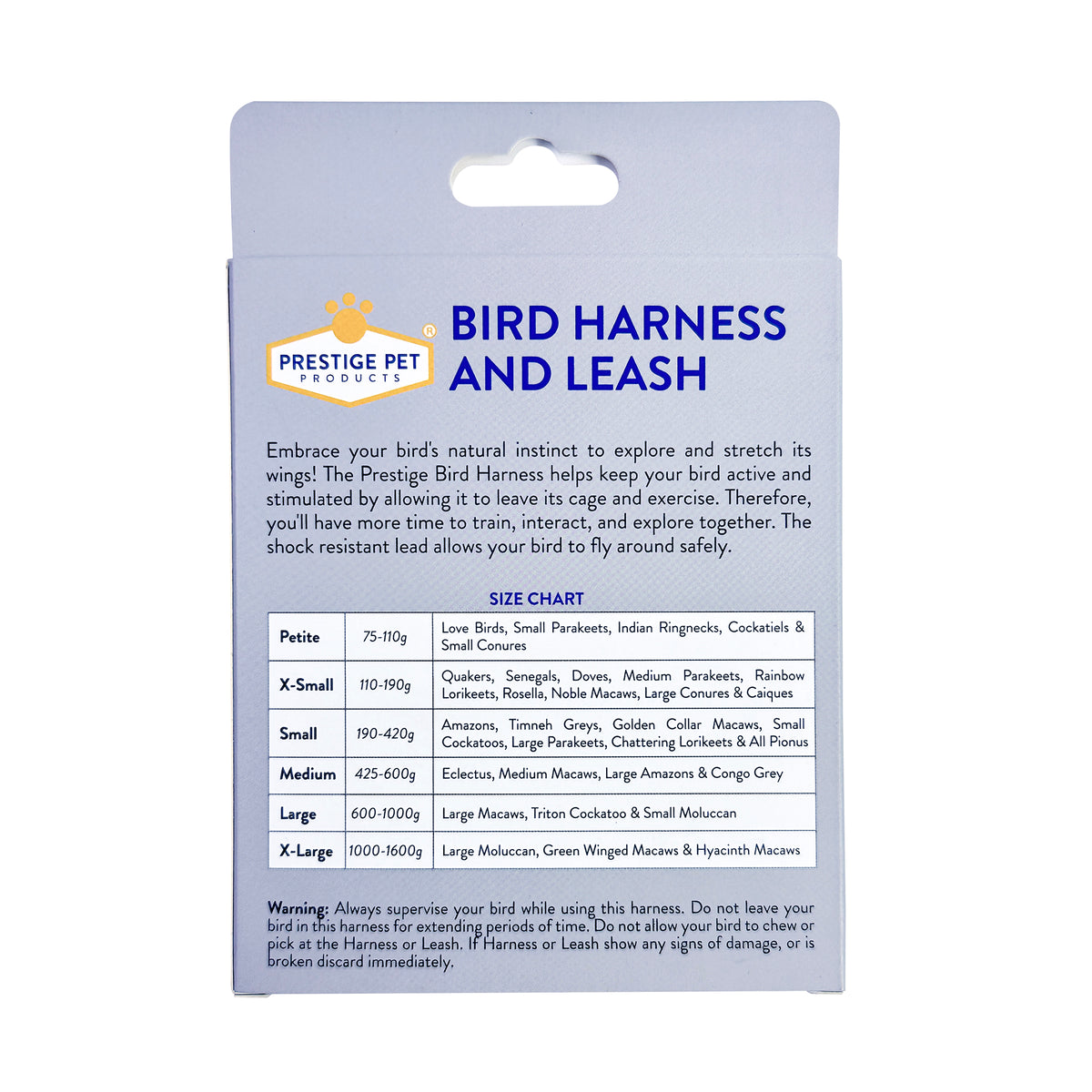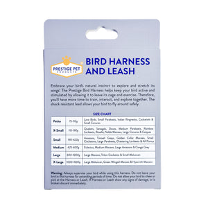 The Prestige Bird Harness and Leash helps keep your bird active and stimulated by allowing it to leave its cage and exercise when using this bird harness and leash. This will allow more time to train, interact and explore together.