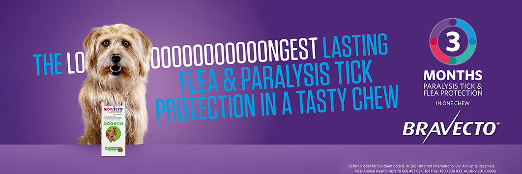 Bravecto Chews are a single dose, long-acting chewable flea and tick treatment for your dog.  Bravecto Chewable Tablets are now available in a 1 month formulation or a 3 month formulation. Choose the formulation that is most convenient and cost effective for you. Available in a range of different sizes to suit your canine friend.