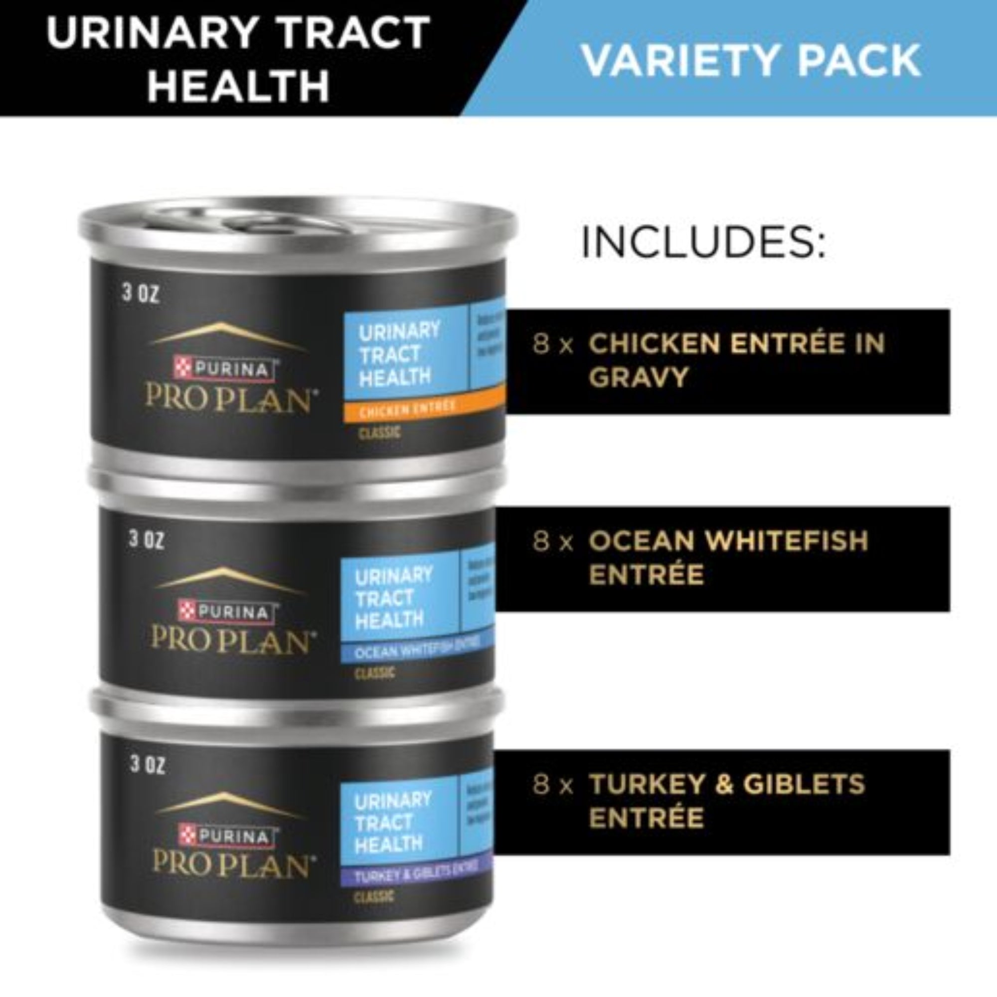 PRO PLAN Urinary Tract Health 24x85g Variety Pack Wet Cat Food offers 3 varieties, made with tender pieces of real poultry or seafood, for a taste cats love.