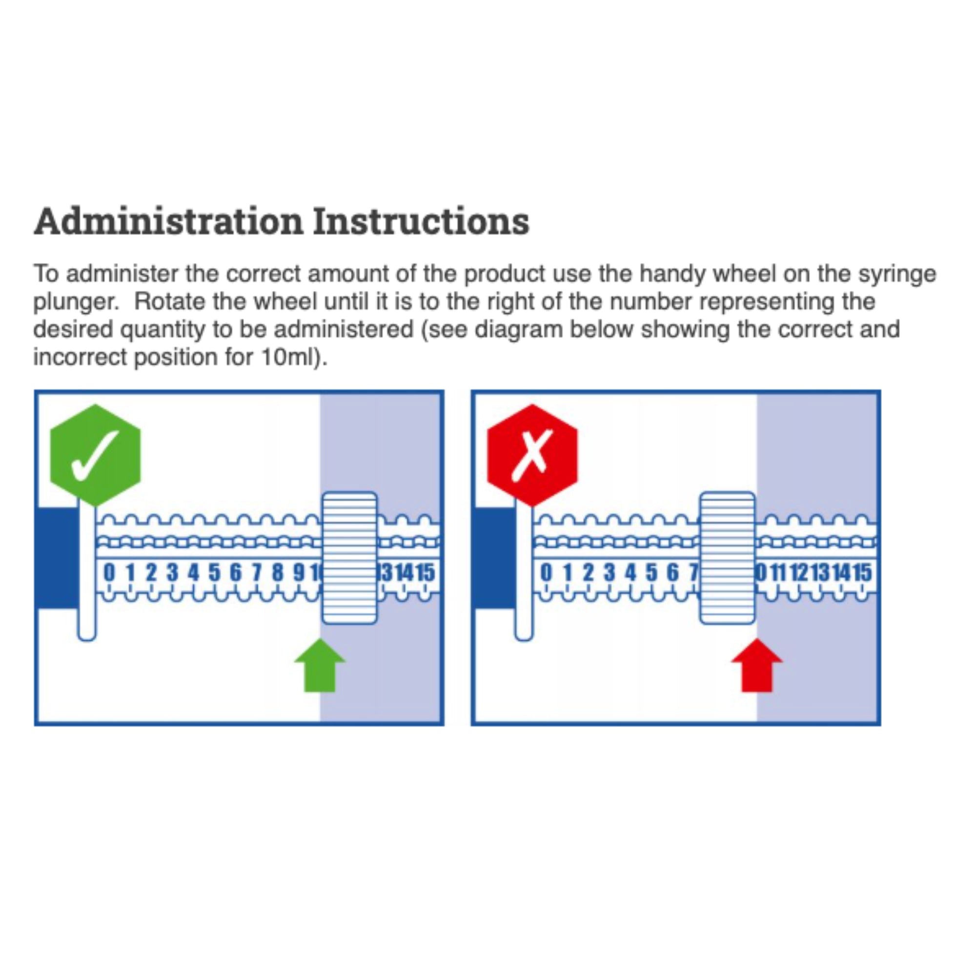To administer the correct amount of the product use the handy wheel on the syringe plunger. Rotate the wheel until it is to the right of the number representing the desired quantity to be administered (see diagram attached showing the correct and incorrect position for 10mL).