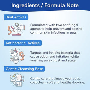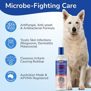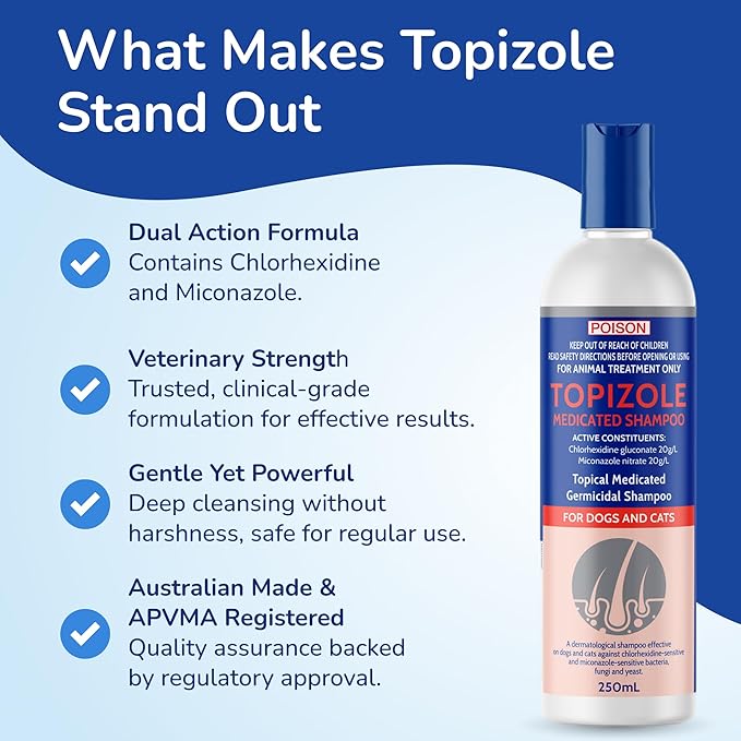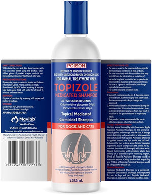 Wet the animal thoroughly with clean water. Apply Topizole Medicated Shampoo to the animal at several points and massage into the coat. A sponge assists lathering and penetration of shampoo into the coat. Ensure that Topizole Medicated Shampoo is applied around the lips, under the tail and between the toes as these areas harbour causative organisms. Leave shampoo on the animal for 10 minutes then rinse off thoroughly with clean water. Repeat twice weekly until symptoms abate, then weekly or as directed by your veterinary surgeon.