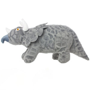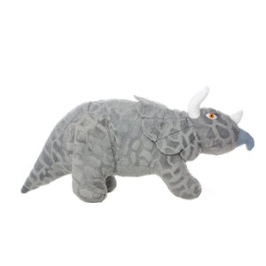 Dinosaur Construction: Each toy is made with 2 layers of industrial grade luggage material and 1 layer of soft fleece on the outside. All of the layers are sewn together to make one super strong layer of material. Each toy is sewn together with 2 layers of linear stitching. After the toy is sewn together an additional piece of black trim is added to cover the four rows of stitching. This extra piece of black trim is sewn with 3 linear stitches to give the product a total of 7 seams! Now that’s one tough toy!