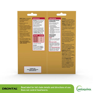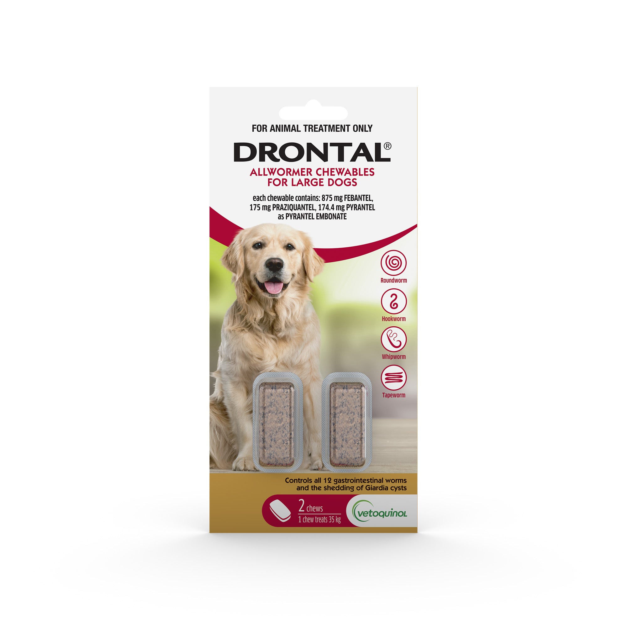 For intestinal worms: One chew treats 35kg bodyweight. It is essential to weigh dogs before treatment. Fasting prior to dosing is not necessary. Administer the dog’s correct dose by mouth. Most dogs will eat Drontal® chews as a tasty treat. If worm problems persist consult a veterinarian.