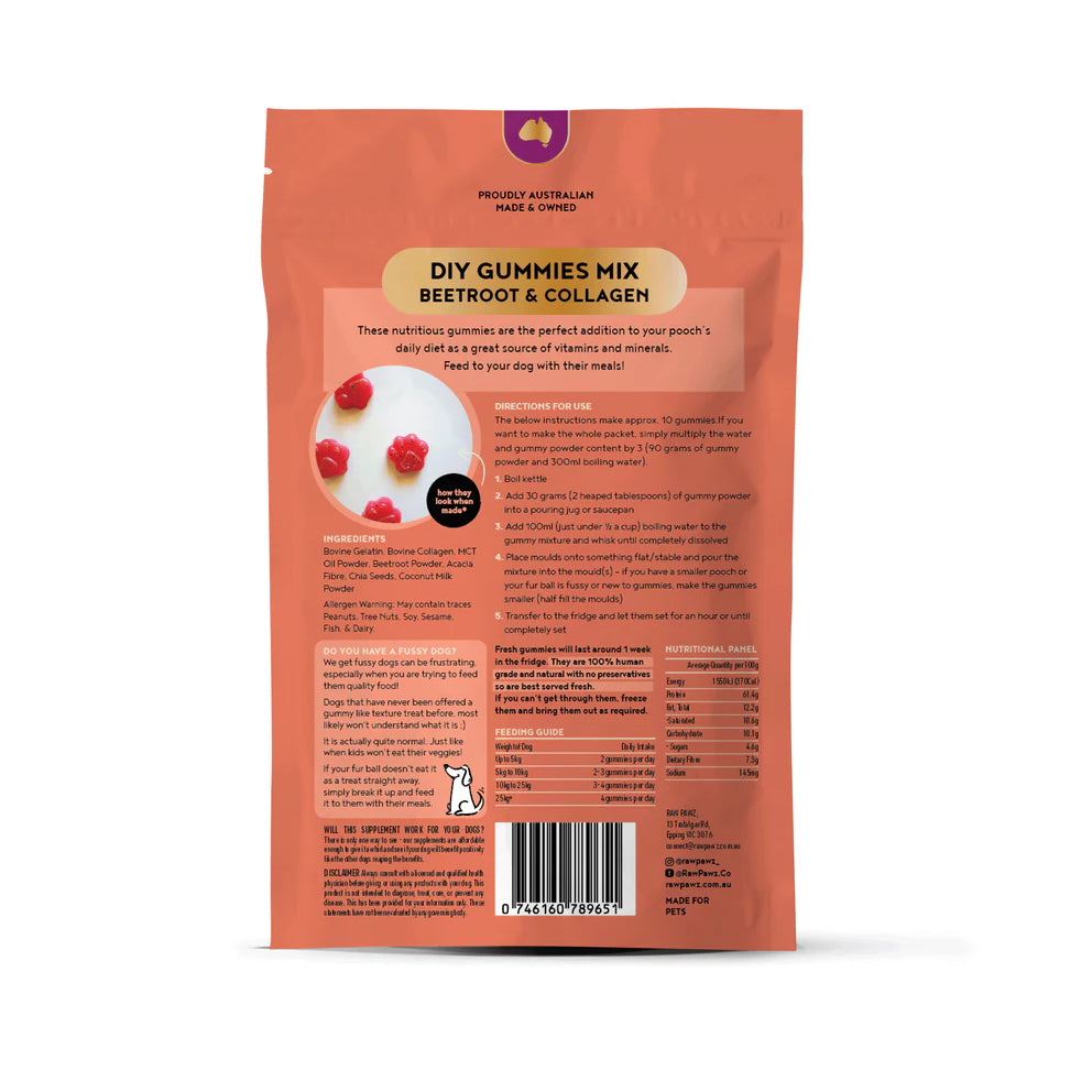 Raw Pawz irresistible Beetroot and Collagen Gummies are enriched with Beetroot Powder, Acacia Fibre, MCT Oil Powder, Chia Seeds, Collagen and Gelatin - all sourced from natural ingredients. Beets, in particular, are a treasure trove of essential nutrients, including vitamin C, fibre, folate, manganese, and potassium. These vitamins and minerals work wonders for your dog's gut health, digestion, and immune system.