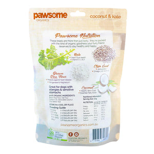 Pawsome Coconut and Kale treats are brimming with nutritious ingredients to enrich your dog’s health. Coconut is a known superfood with antibacterial, antiviral and antifungal properties to give the immune system a boost. It is also full of omega-6 which helps keep the coat nice and shiny. In addition to this, the magnesium, vitamin K and iron in the kale, aid to improve the health of the entire cardiovascular system, which will keep the heart stronger.
