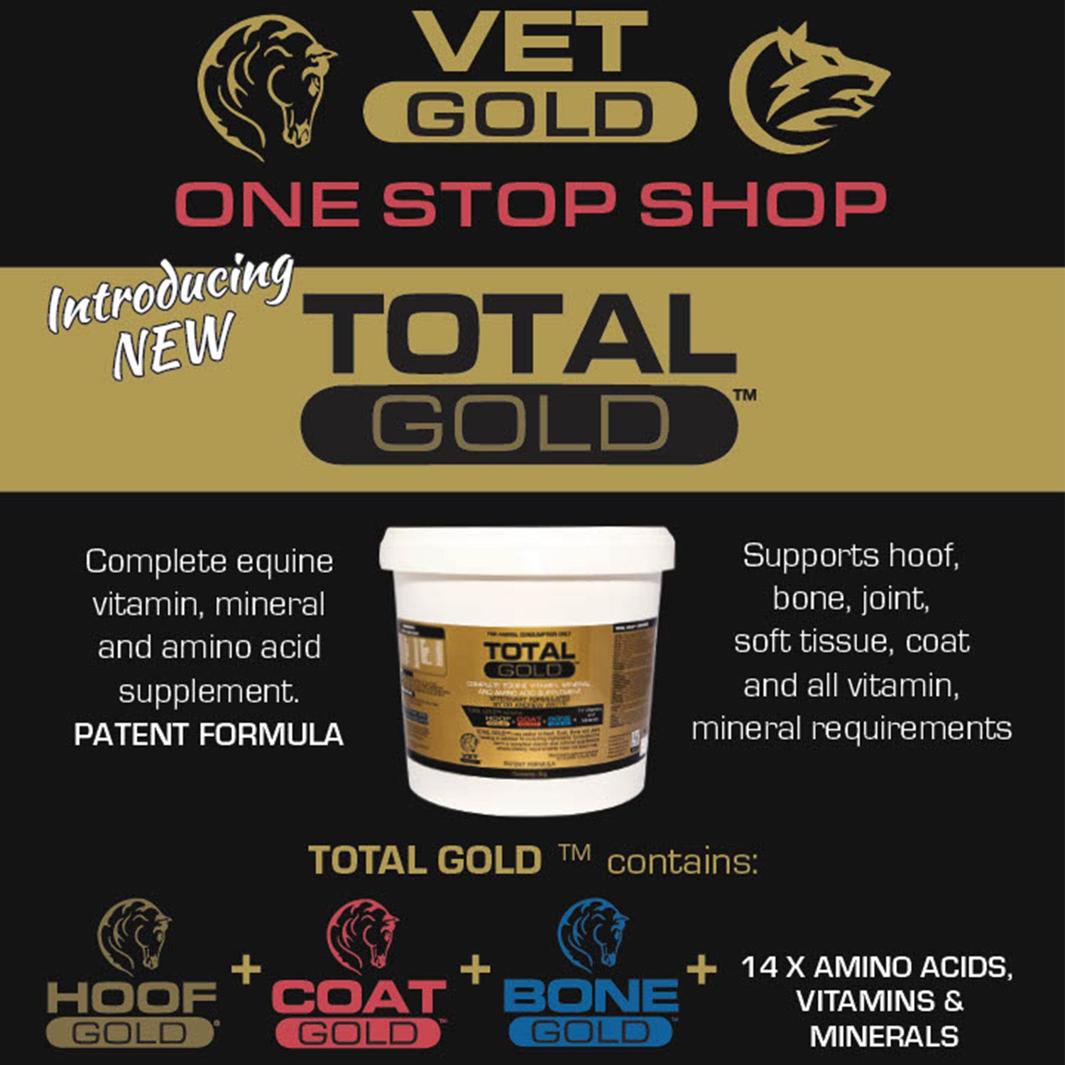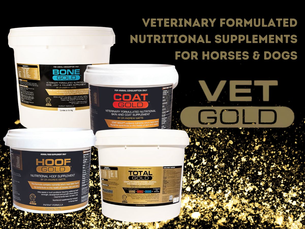 Following the success of their original products Vet Gold had received a massive amount of calls and emails from Veterinarians, Farriers and clients requesting a complete formulation – a supplement that fulfils all their horse’s needs with the benefits of all the Vet Gold supplements combined. After 12 months of research and development Vet Gold are proud to release their next generation product: TOTAL GOLD – an industry first, finally a supplement that completes all your horses needs in addition to the comfort of knowing there are Veterinary Reports detailing clinical and radiological responses to supplementation.