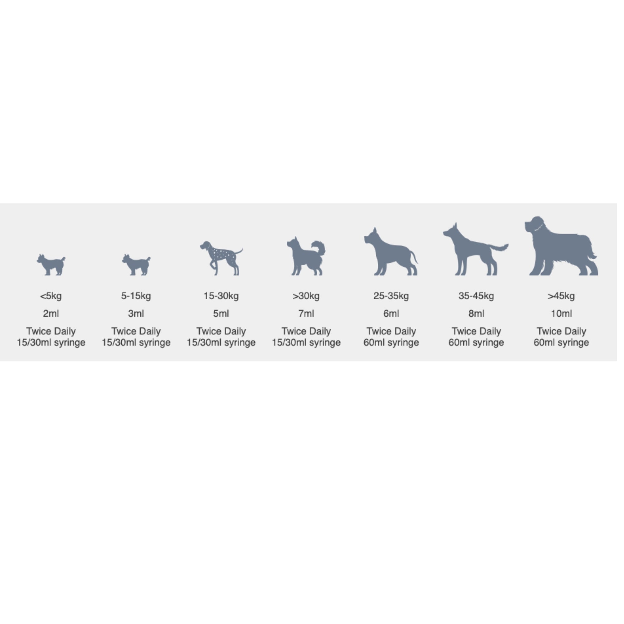 We recommend using 15ml and 30ml syringes for small to medium dogs but also in a handy 60ml syringe for larger dogs.
