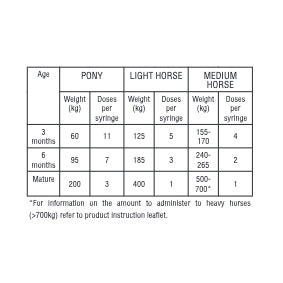 Precautions: DO NOT ADMINISTER THE FULL SYRINGE TO HORSES UNDER 500 kg. USE WITH CAUTION IN FOALS AND SMALLER BREEDS BY CAREFULLY CALIBRATING THE DOSE AND AVOID OVERDOSING.