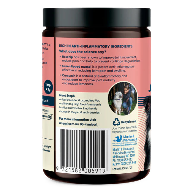 Enhance mobility, reduce arthritic symptoms, including inflammation and joint pain with functional Anipal Joint Formula Powder Meal Topper powder. This Joint Formula is a unique & science led combination of ingredients including Rosehip, Green Lipped Mussel and Curcumin to aid mobility and reduce lameness in dogs.