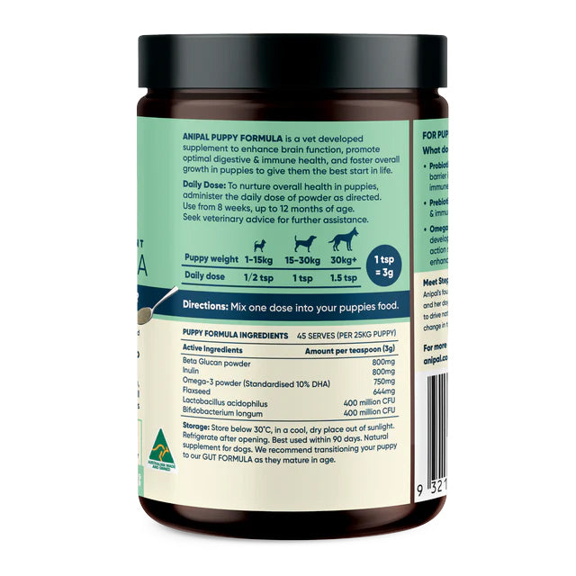 Suitable for puppies from 8 weeks, up to 12-18 months of age. It is recommended transitioning your puppy to Anipal’s Gut Formula as they mature in age.