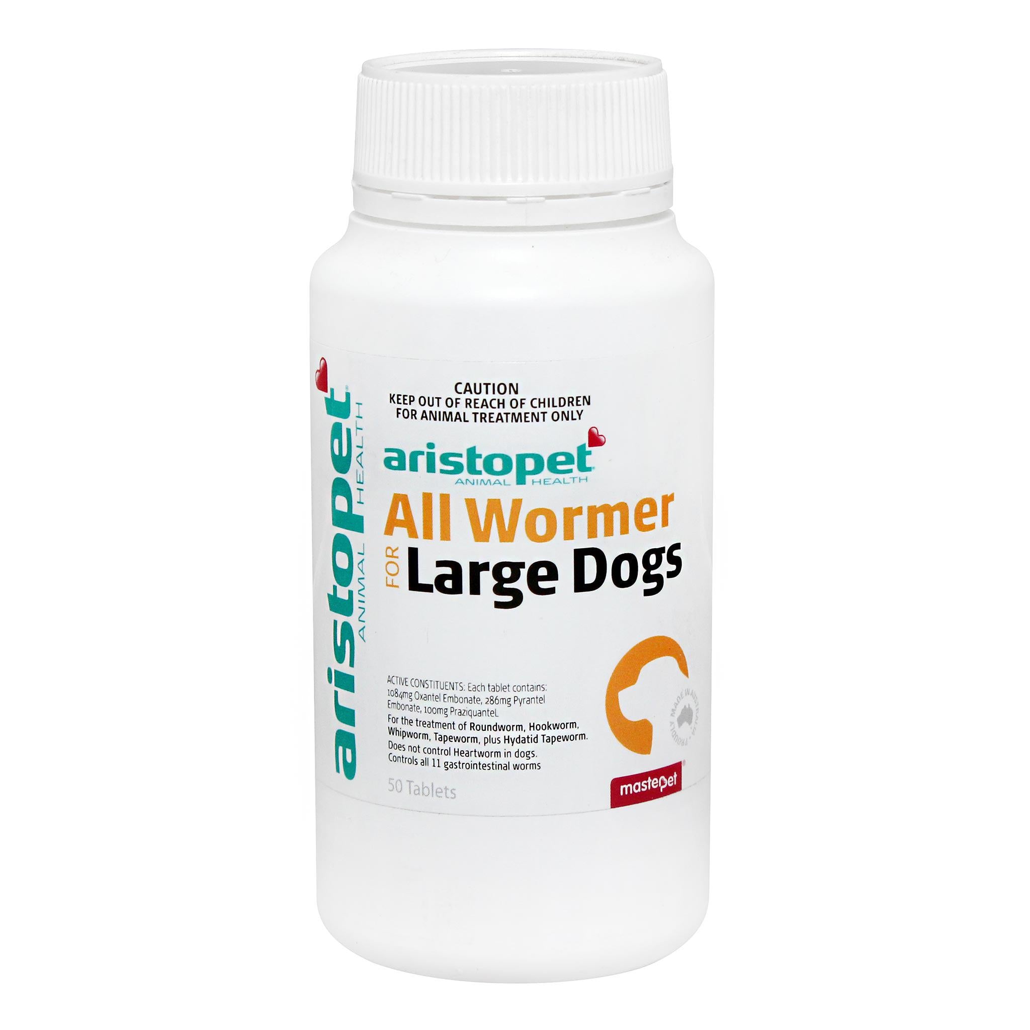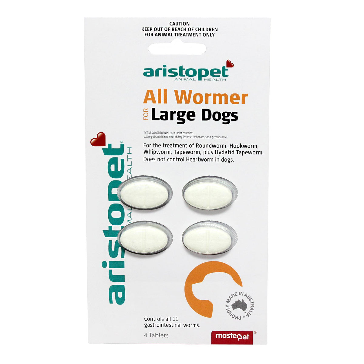 Aristopet All Wormer Tablets for Large Dogs is for the treatment of Roundworm, Hookworm, Whipworm, Tapeworm, plus Hydatid Tapeworm. Does not control Heartworm in dogs. Controls all 11 gastrointestinal worms.