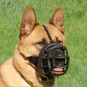 This muzzle is the best I have found for my unsocialised farm kelpie because the strap which goes over her head can be undone and attached to her collar so that she can't pull it off. She has pulled every other muzzle off when I take her to the vet. She is extremely protective towards me. It is also great for breathing as well.