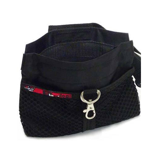 The Pouch has a Waist Belt attached. It has 2 mesh pockets (for holding a training clicker, or plastic bags to pick up after your dog, etc) and a D Ring on the front to hold a lead.