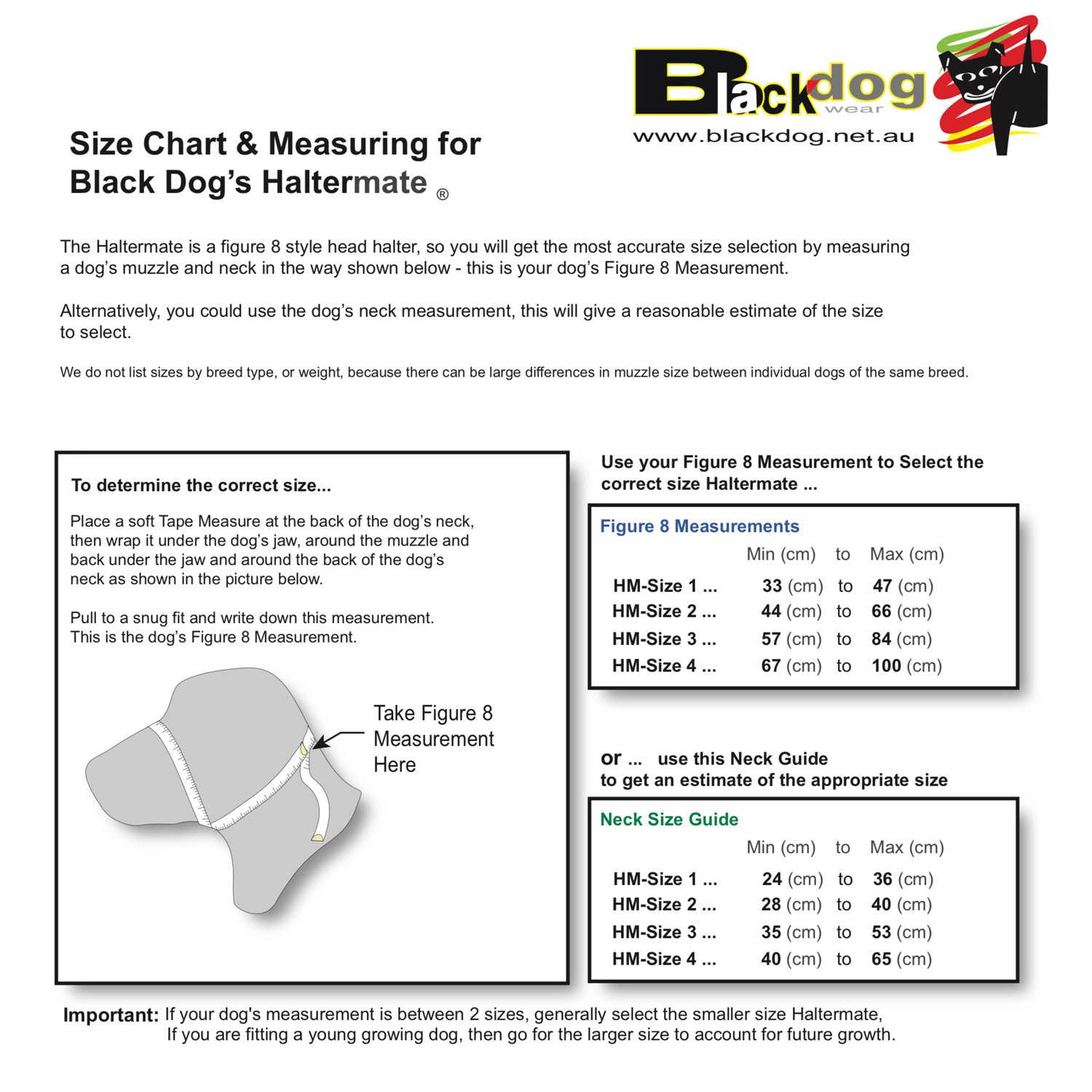 The Haltermate is a figure 8 style head halter, so you will get the most accurate size selection by measuring a dog’s muzzle and neck in the way shown below - this is your dog’s Figure 8 Measurement.