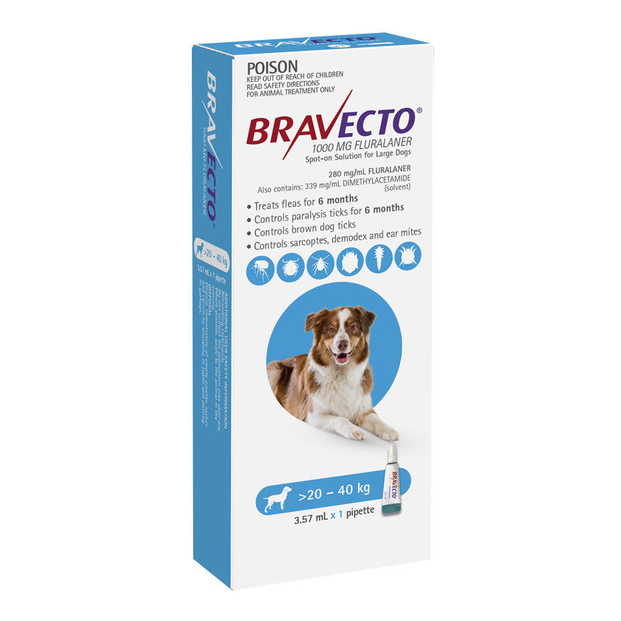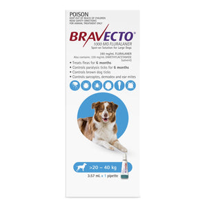 Bravecto Spot-on Blue is a spot-on flea and tick treatment for large dogs weighing between 20kgs and 40kgs that provides up to of 6 months protection in a single dose.