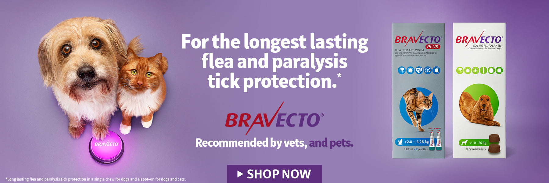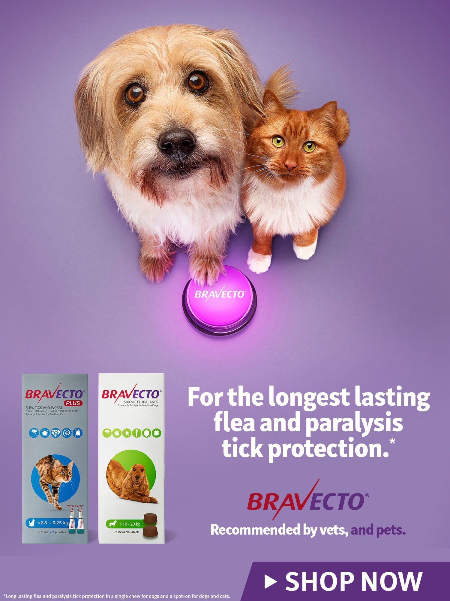 Bravecto provides a leading line of defence against nasty parasites. No matter how you choose to dose your pet, Bravecto delivers long lasting flea and paralysis tick protection in a single dose.