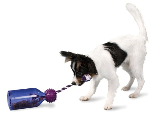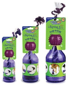 The Tug-A-Jug treat dispensing dog toy provides a multi-sensory appeal to keep your dog engaged and motivated to play. Its unique design allows dogs to see, smell and hear the treats as they roll around in the jug. The Tug-A-Jug not only dispenses treats, it can used for obedience training and feeding meals. Treats and dry food dispense as the toy is tipped, tugged and rolled.