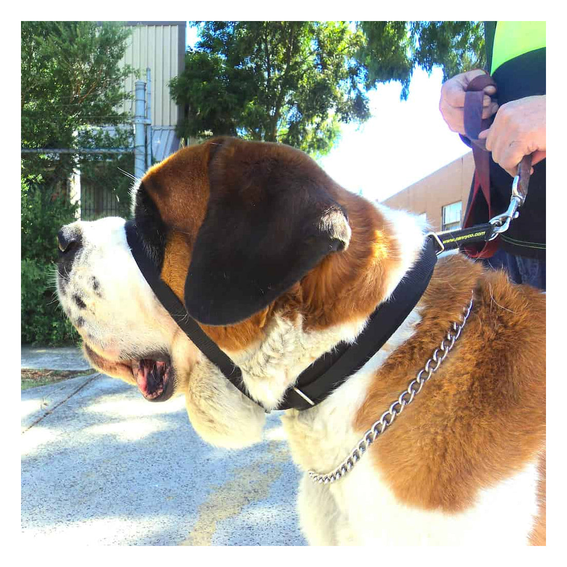 Unlike a head collar, the Canny Collar is made up of a conventional collar with a slip line that fits over your dog's nose. The lead attaches behind your dog's head rather than under his chin.