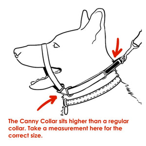 Ensure you purchase the correct size for your dog. A snug fit is essential to ensure it cannot come off. To ensure your Canny Collar fits accurately and for safe and effective dog walking, take a tape and measure around your dog's neck snugly, to just behind the ears. Then, choose the correct size Canny Collar for your dog using the following measurements: