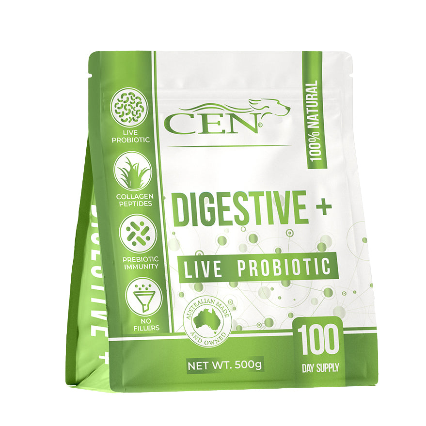 The inclusion of Live Probiotic S. boulardii contained in Digestive + is unique in that it can’t be killed by antibiotics. It helps restore your dog’s microbiome during and after antibiotic use and has been successfully used to treat Yeast Infections and Candida.