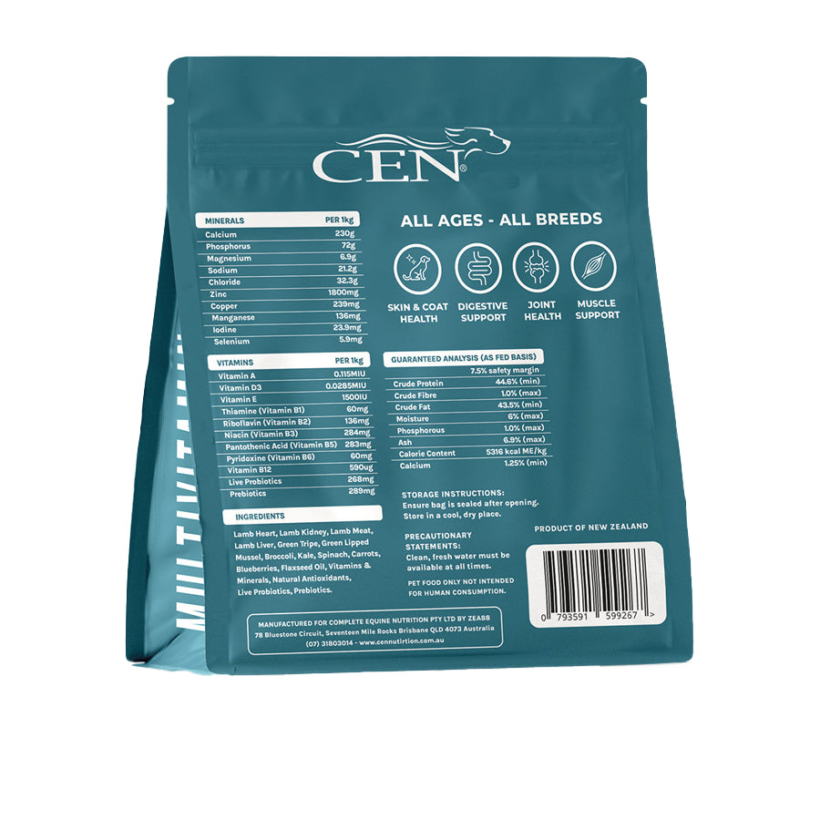 Lamb Heart, Lamb Kidney, Lamb Meat, Lamb Liver, Green Tripe, Green Lipped Mussel, Australian Kelp, Broccoli, Kale, Spinach, Carrots, Blueberries, Flaxseed Oil, Vitamins & Minerals, Natural Antioxidants, Live Probiotics, Prebiotics.
