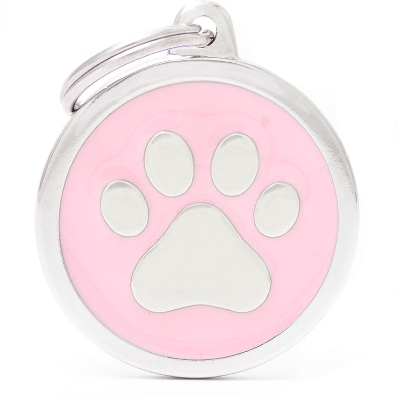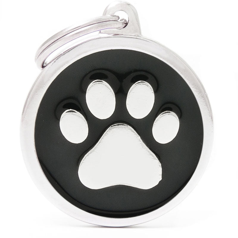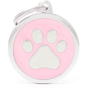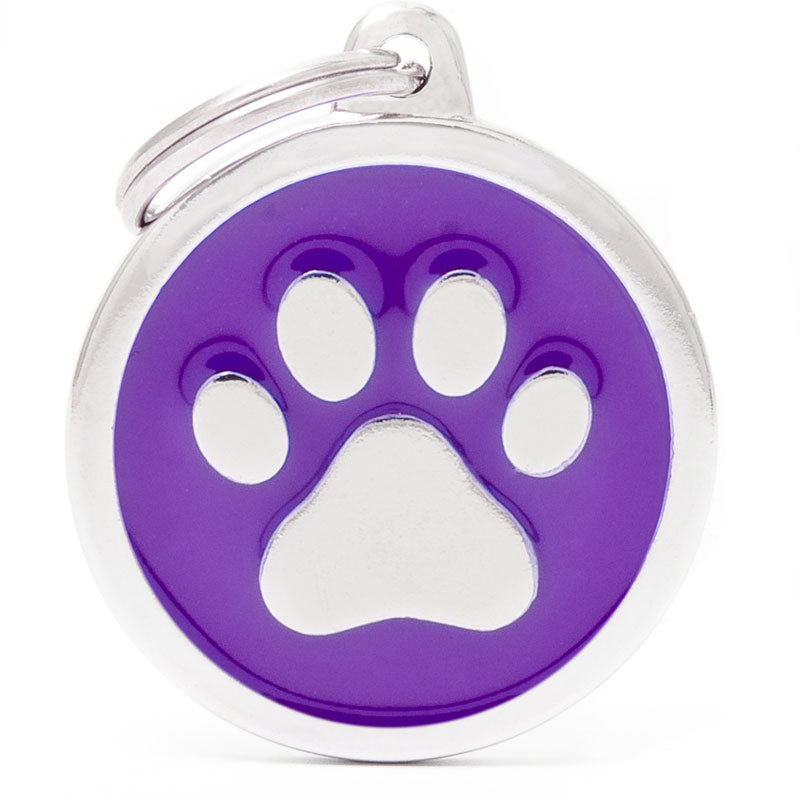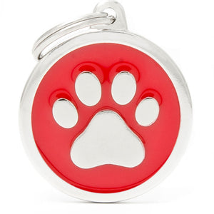 The My Family Classic Big Circle Paw Pet ID Tag is fun, trendy, bizarre, eye-catching. For happy, lively dogs.