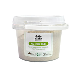 CLEAR Dog Treats specially formulated organic bone broth for dogs has been developed in partnership with a leading Australian organic bone broth manufacturer for humans.