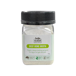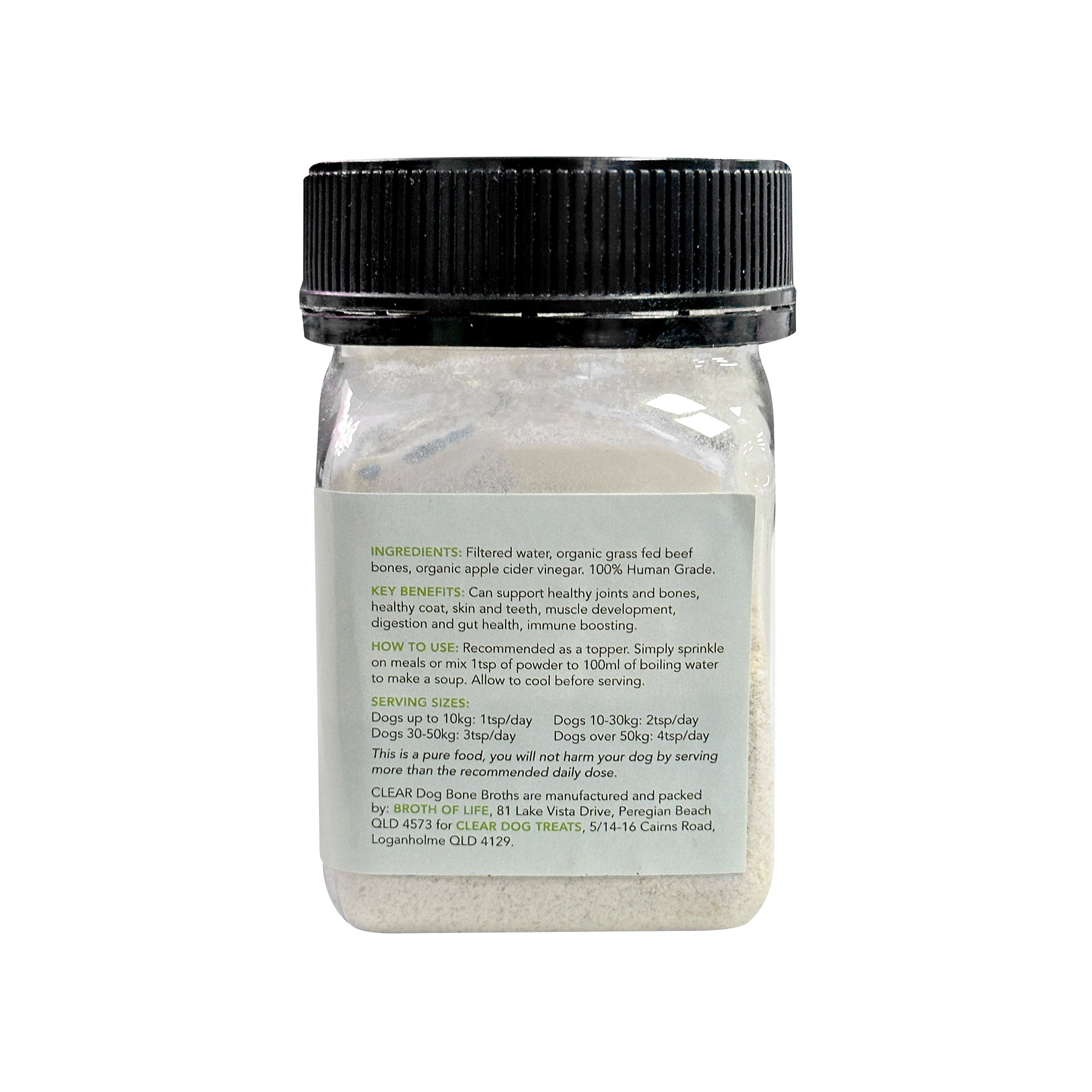CLEAR Dog bone broth comes in a powder form making it super easy to give to your dog by sprinkling it on their food. You can however re-hydrate it by adding it to warm water if it suits you better.