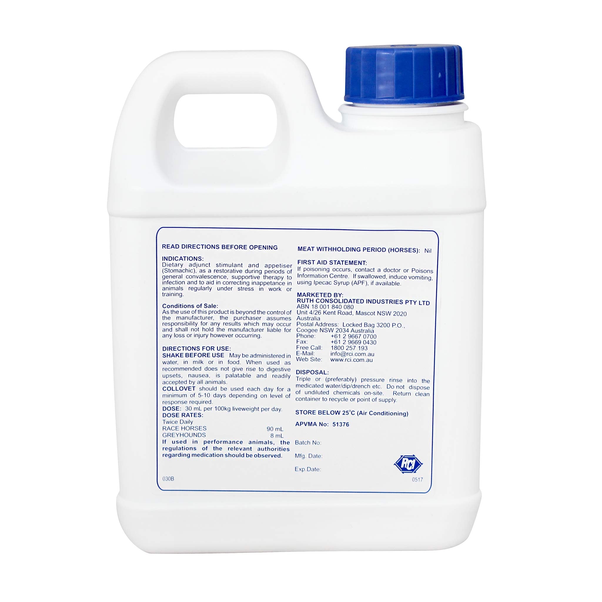 Collovet is an extremely palatable water soluble liquid manufactured in Australia by Ruth Consolidated Industries Pty Ltd. It is readily accepted by all animals, increasing mental alertness and capacity for muscular work. It is most useful where animals are suffering from performance or handling stress and where they are off their feed or suffering from "training off syndrome" or recovering from illness.