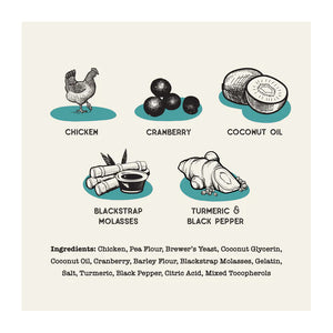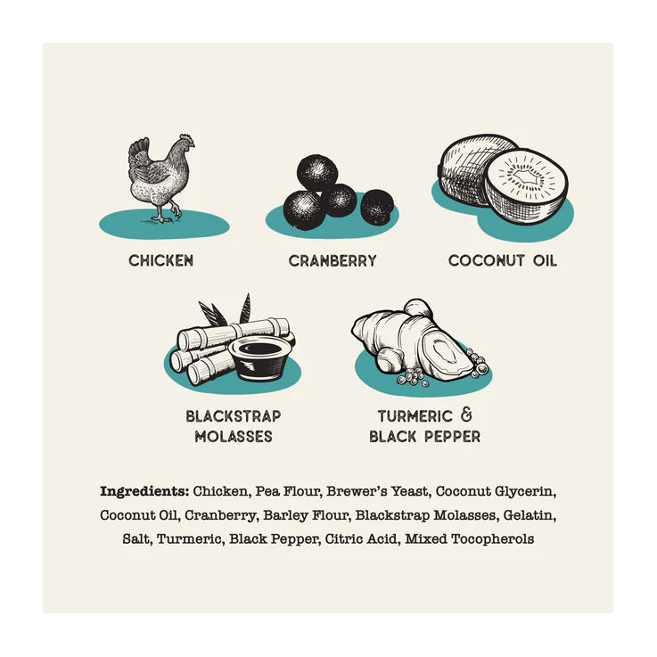 Chicken, pea flour, brewer's yeast, coconut glycerin, coconut oil, cranberry, barley flour, blackstrap molasses, gelatin, salt, turmeric, black pepper, citric acid, mixed tocopherols