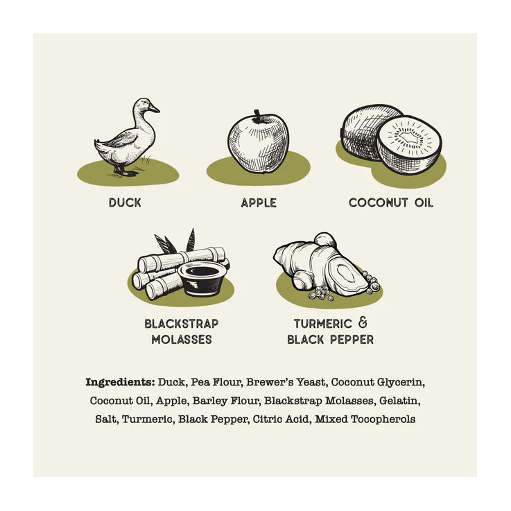 Duck, pea flour, brewer's yeast, coconut glycerin, coconut oil, apple, barley flour, blackstrap molasses, gelatin, salt, turmeric, black pepper, citric acid, mixed tocopherols