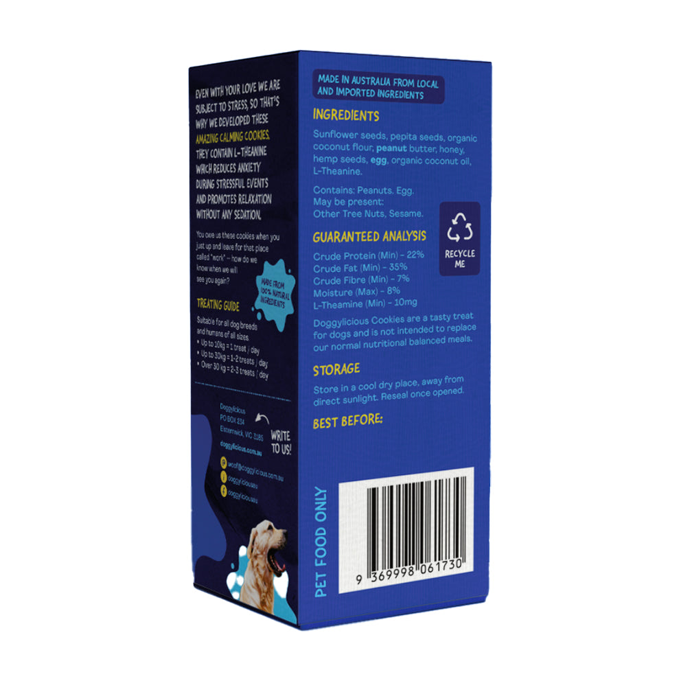 A dog’s life can have its stressful times you know. So that’s why Doggylicious developed these amazing calming cookies. They contain L-Theanine which reduces anxiety during stressful events and promotes relaxation without sedation.