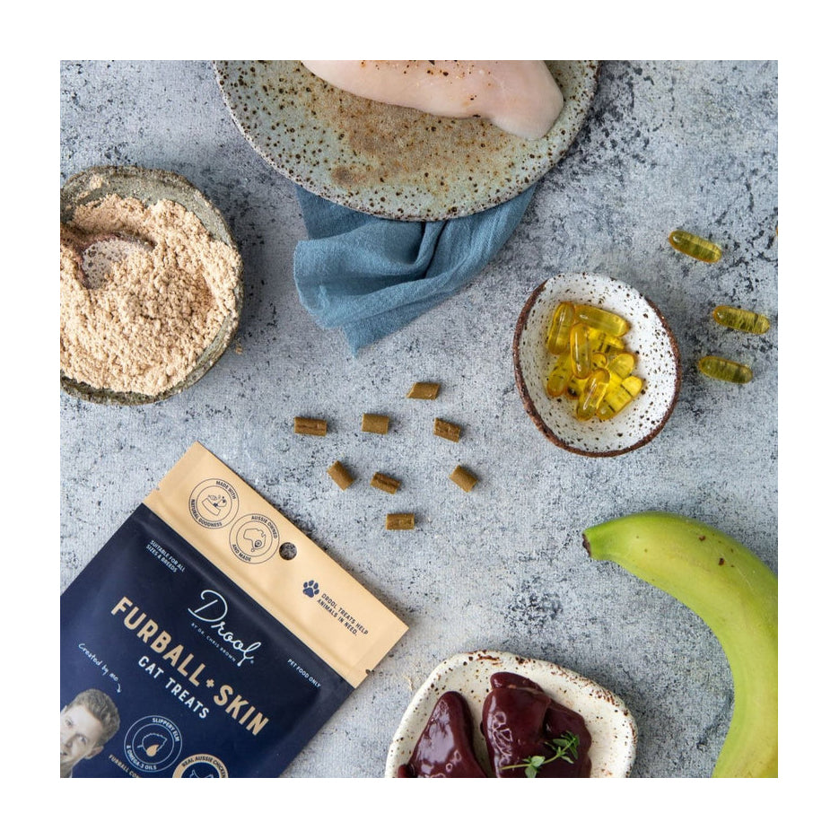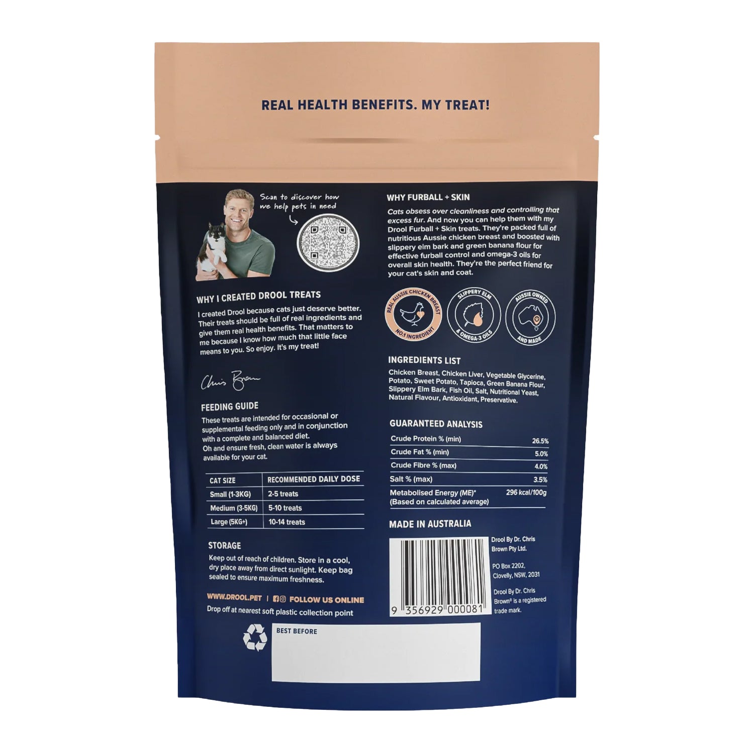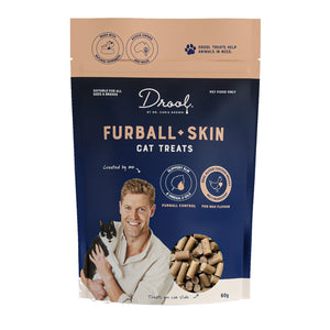 Cats obsess over cleanliness and controlling that excess fur. Luckily so can you with these Drool Furball + Skin treats. They're packed full of nutritious Aussie chicken breast and boosted with slippery elm bark and green banana flour for handy furball control and omega-3 oils for overall skin health.