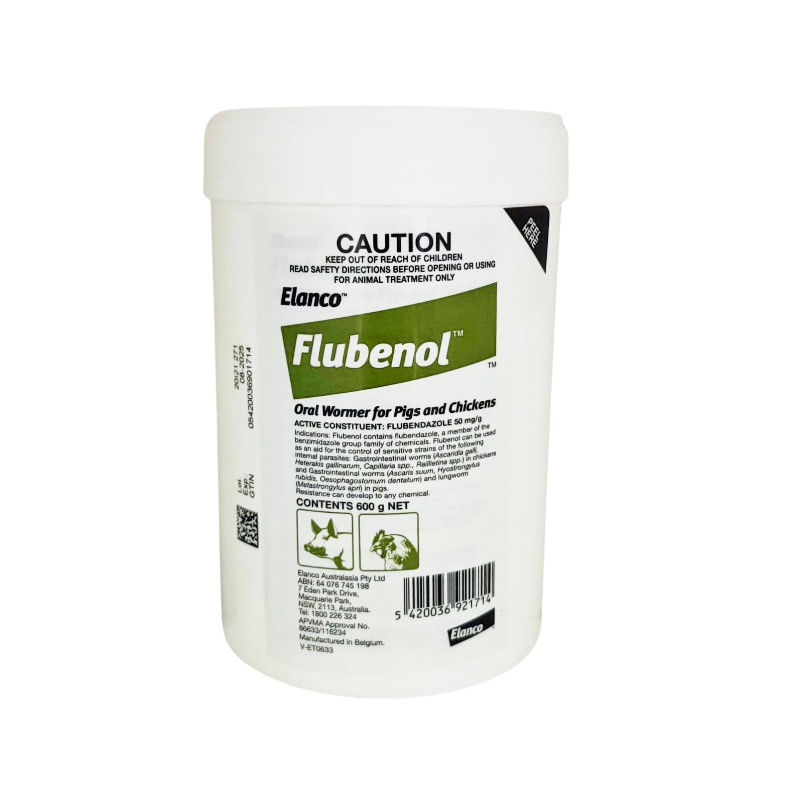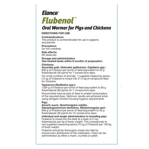 Flubenol is a broad-spectrum de-wormer mixed into a premix or final feed. It contains flubendazole, which has efficacy against all life stages of commonly found worms in chickens.