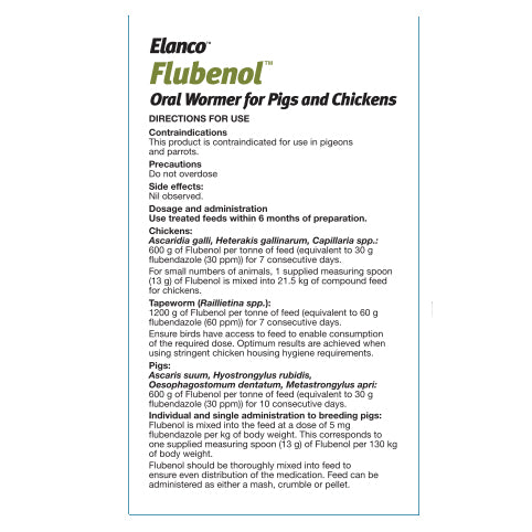Mix 600 g of Flubenol per tonne of feed (equivalent to 30 g flubendazole or 30 ppm) for 7 consecutive days. For small numbers of birds, mix 1 supplied measuring spoon (13 g) of Flubenol into 21.5 kg of compound feed.