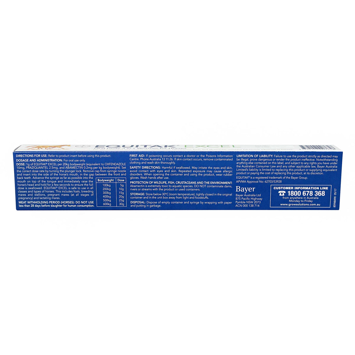 General dose rate: 1 g Equitak Excel Paste per 20 kg bodyweight, equivalent to: