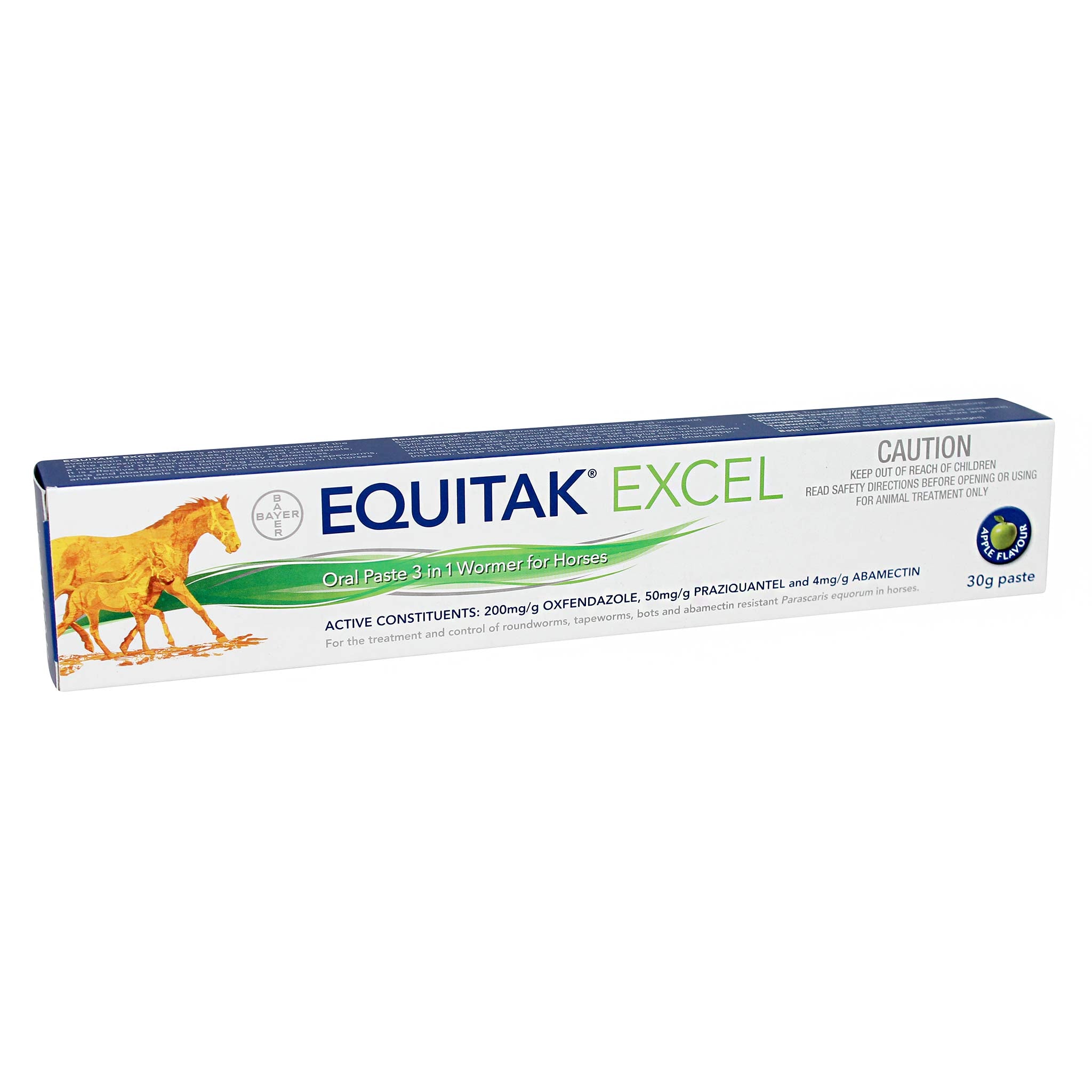 Equitak Excel Paste is a broad-spectrum horse wormer for the treatment and control of all major roundworms, tapeworms and bots, including abamectin-resistant Parascaris equorum and benzimidazole-resistant small strongyles.