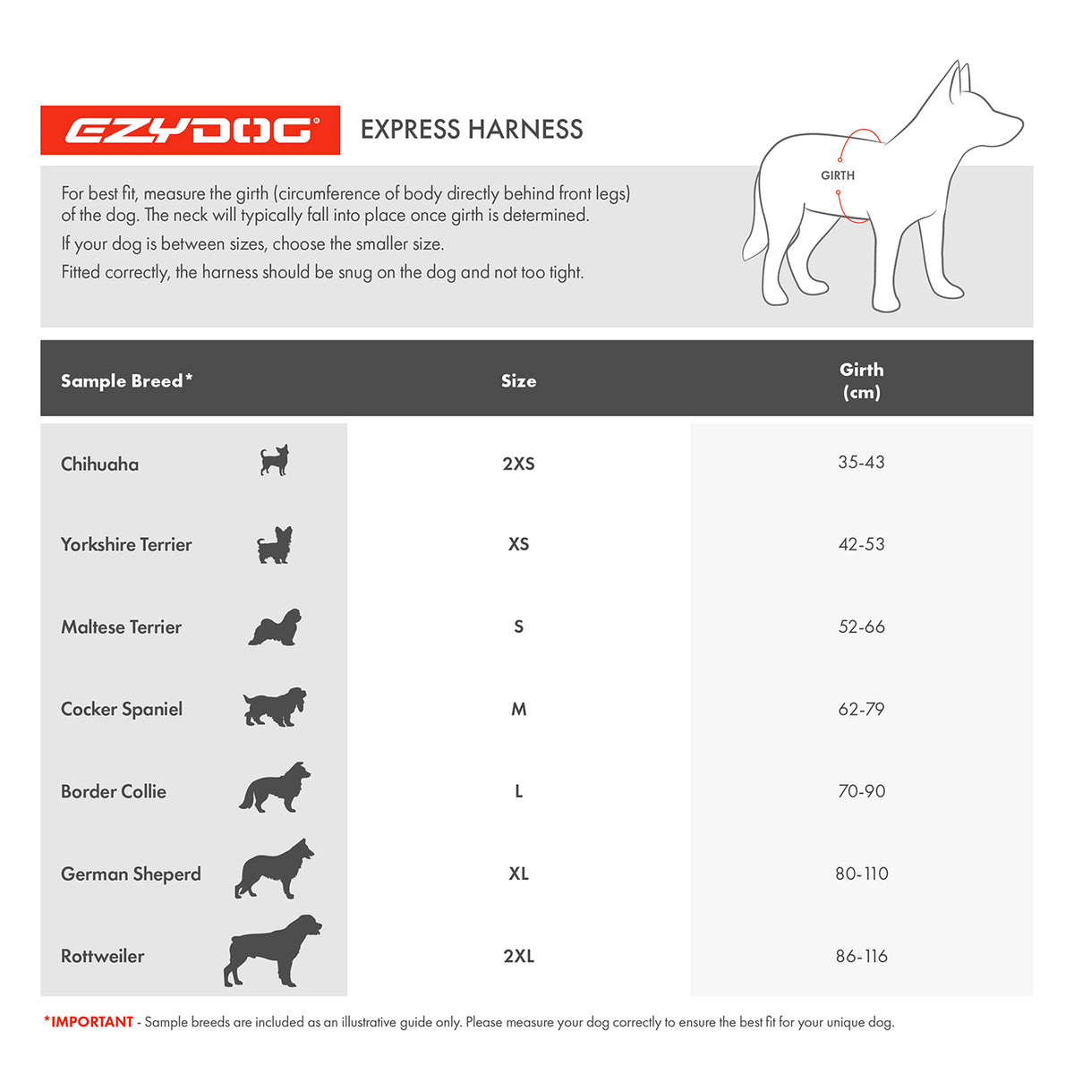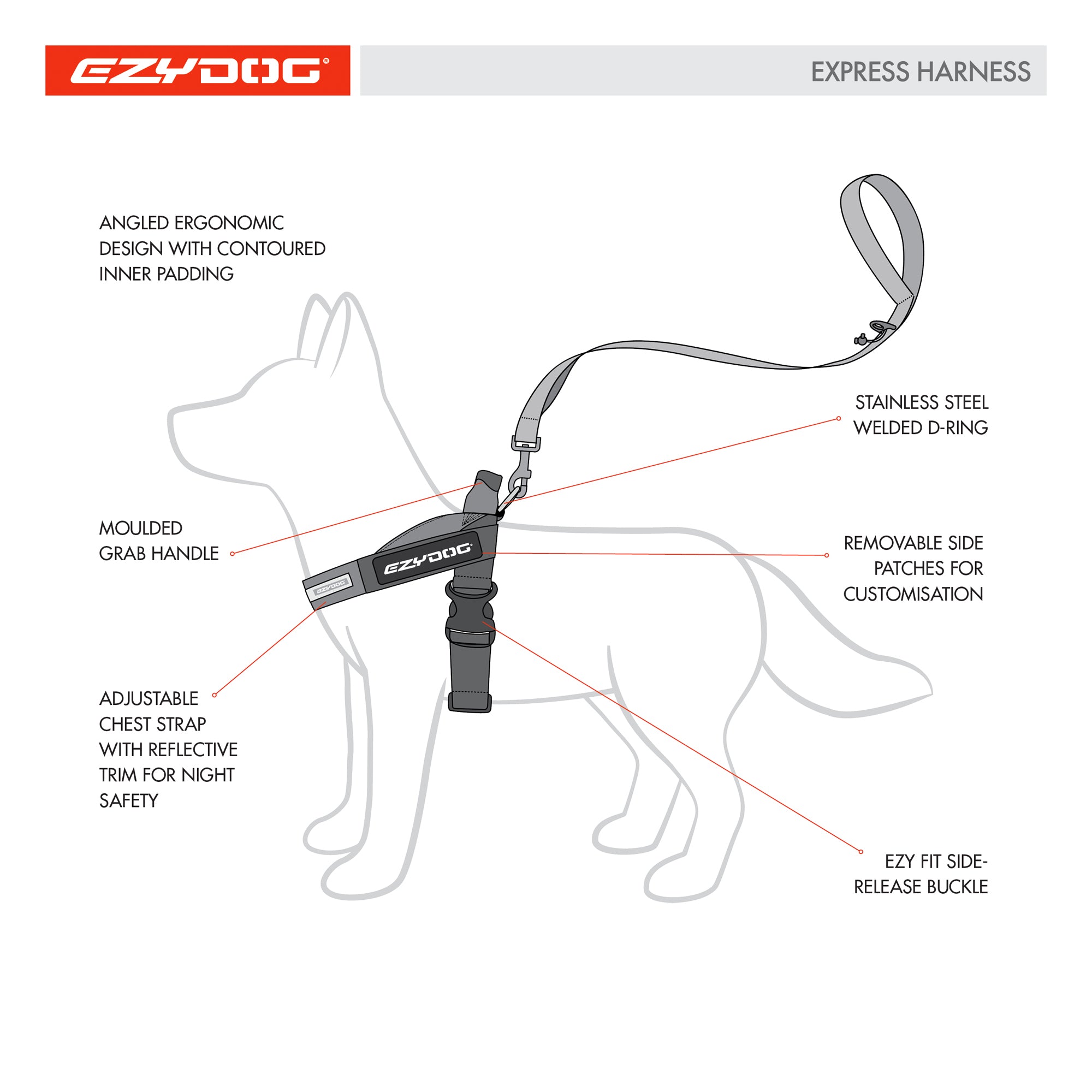 The Express Harness is a quick fit harness that is easy to adjust to your dog's shape, featuring contouring EVA pads, a moulded grab handle, reflective trim and a stainless steel D-ring for leash attachment.