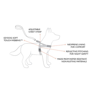 This Dog Harness really is as simple to fit as a collar, but it has also been designed to be comfortable on your dog. Soft neoprene is placed against your dog's chest and the EzyDog soft touch webbing is used in all other contact areas. It has also been meticulously constructed to minimise any pinching or chafing, meaning your furry friend will actually look forward to putting it on.