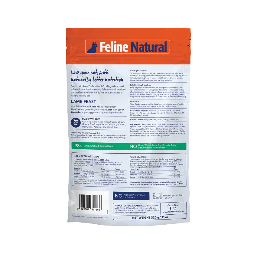 Feline Natural Lamb Feast Freeze-dried cat food is complete & balanced, nutrient-dense, and as close to a raw diet as you can get.