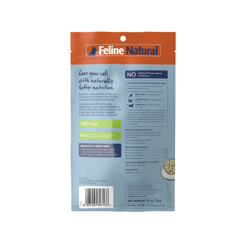Sourcing only the highest quality New Zealand grass-fed, free-range tripe, Feline Natural Freeze-Dried Tripe Booster aids digestion, skin, coat, and immune function.