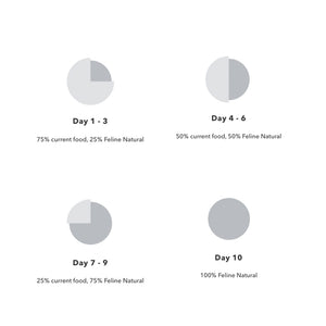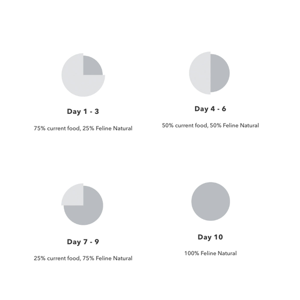 When transitioning your cat to a Feline Natural feast, start by mixing a small amount into their current food following the guide attached, slowly increasing the amount of Feline Natural over 10 days until your cat enjoys a full bowl of Feline Natural.