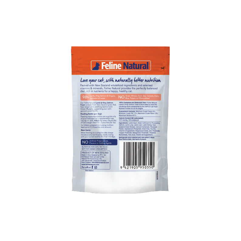 Feline Natural pouched cat food can be served on it's own as a complete & balanced meal, or served on top of your cat's existing food to increase it's nutrient content and improve it's taste.
