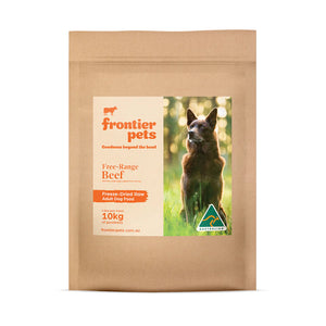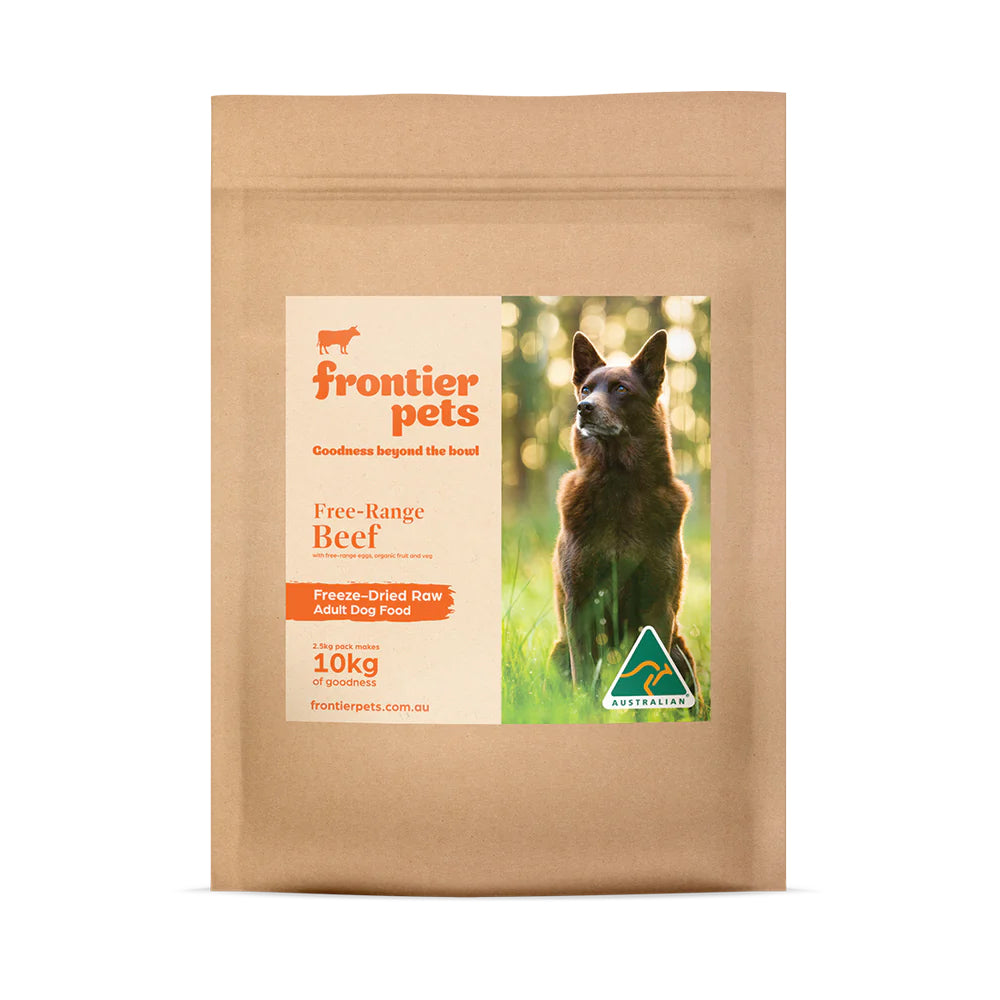Frontier Pets Free-Range Australian Beef Raw Freeze-Dried Adult Dog Food is freeze-dried so that the colours, flavours, smells and nutritional content remain intact. This process provides a complete, balanced food developed in conjunction with a holistic animal nutritionist & vet with over 30 years experience.