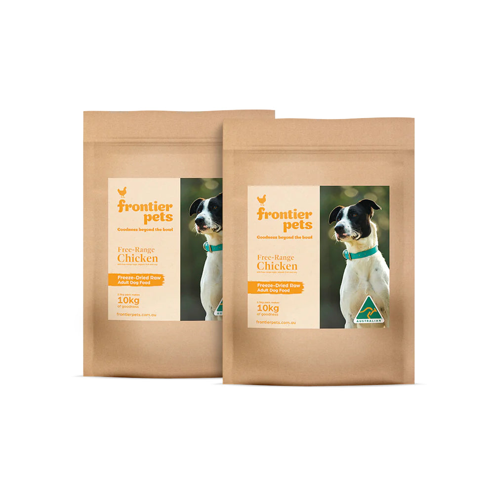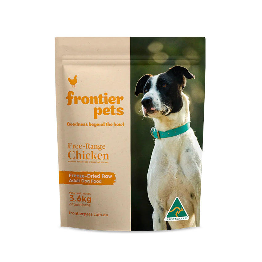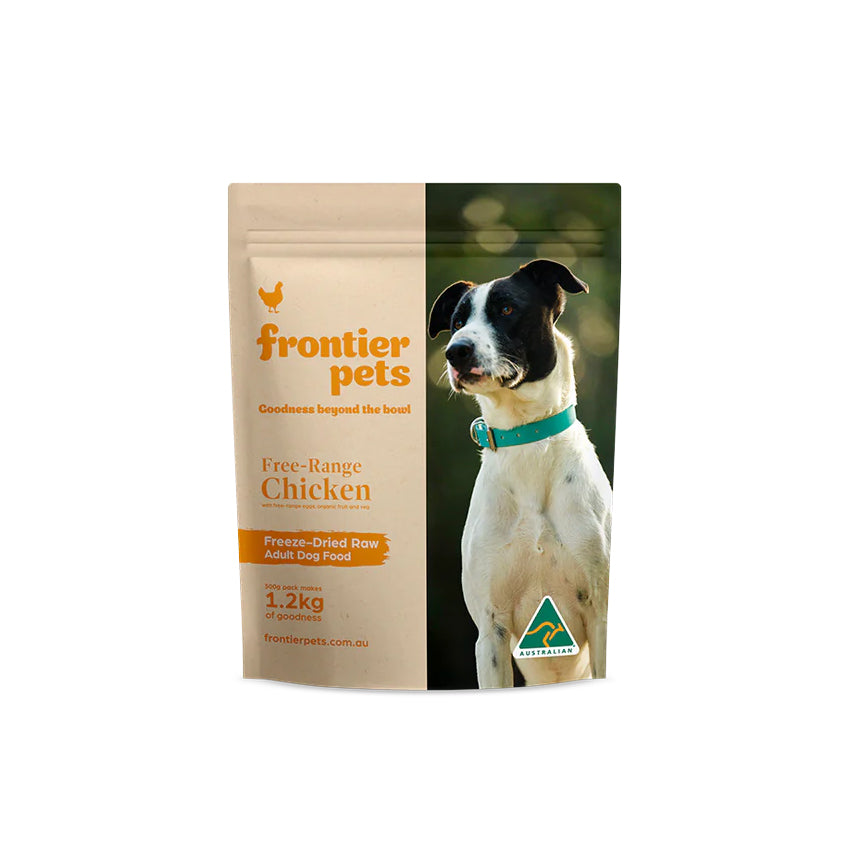 Frontier Pets Free-Range Australian Chicken Raw Freeze-Dried Adult Dog Food is made using free-range, raw, organic and human-grade ingredients. It is freeze-dried so that the colours, flavours, smells and nutritional content remain intact.