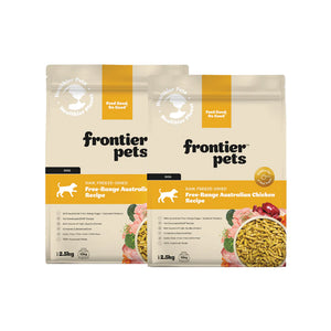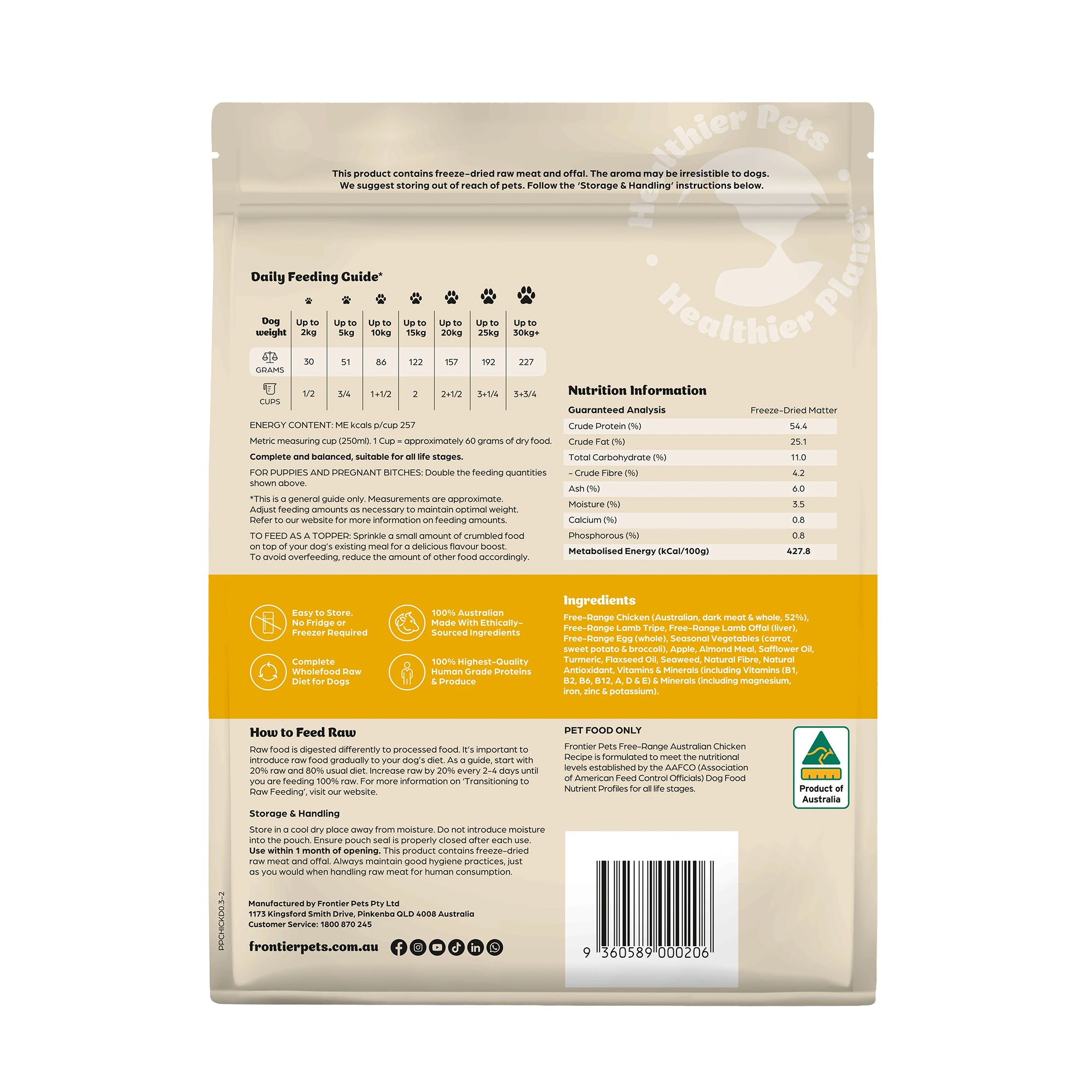 Frontier Pets Free-Range Australian Chicken Raw Freeze-Dried Adult Dog Food is made using free-range, raw, organic and human-grade ingredients. It is freeze-dried so that the colours, flavours, smells and nutritional content remain intact.