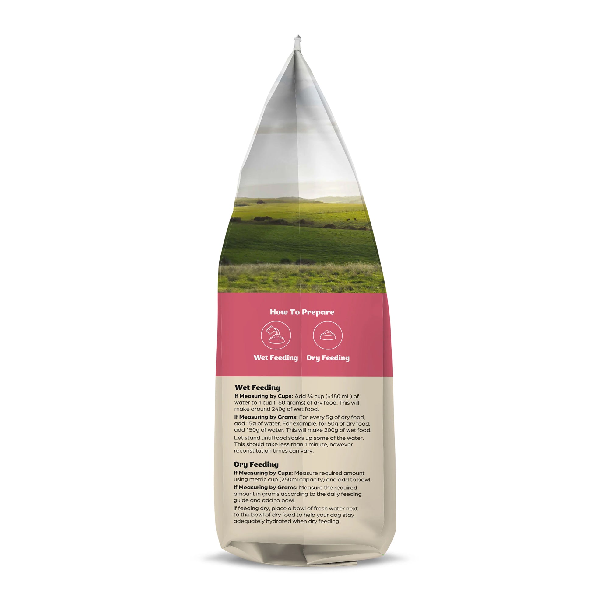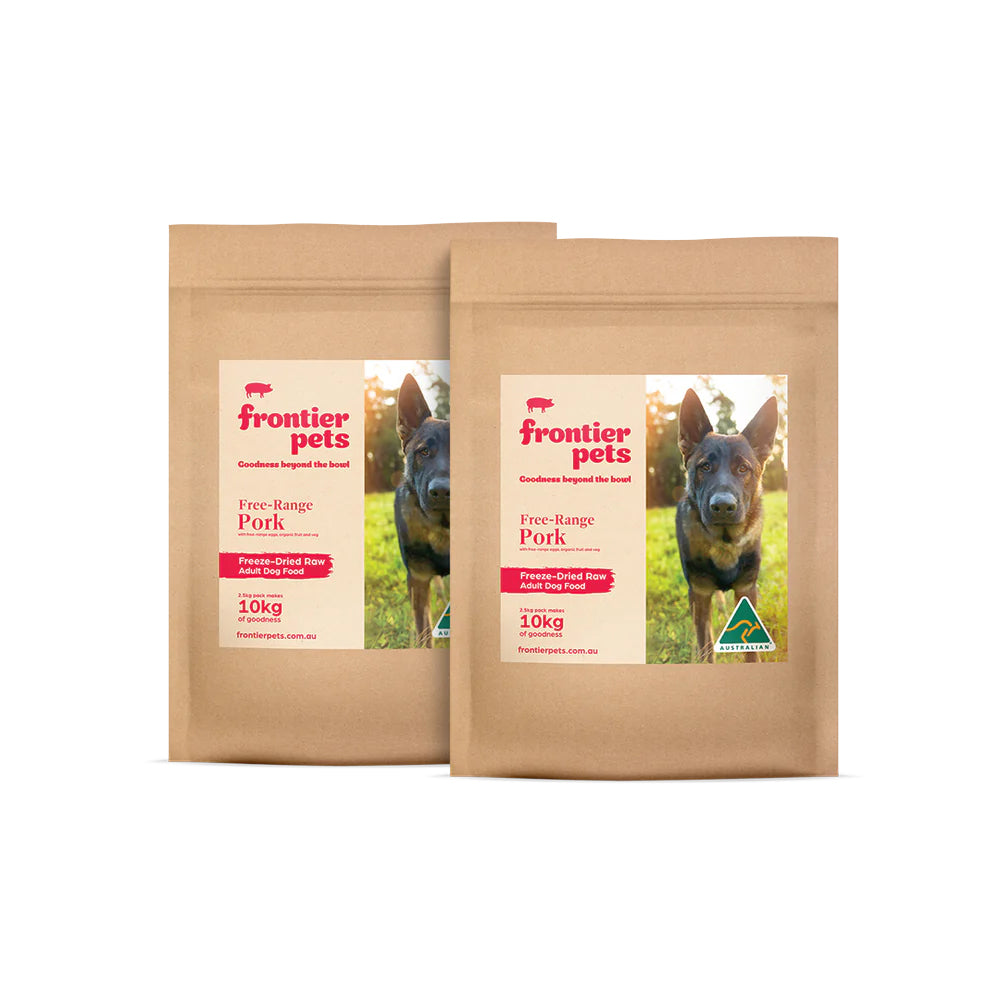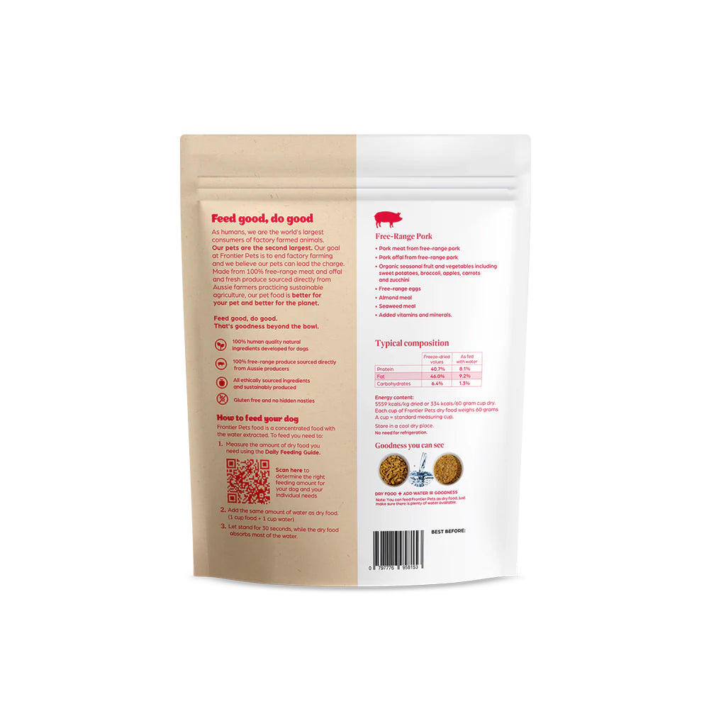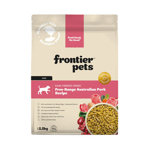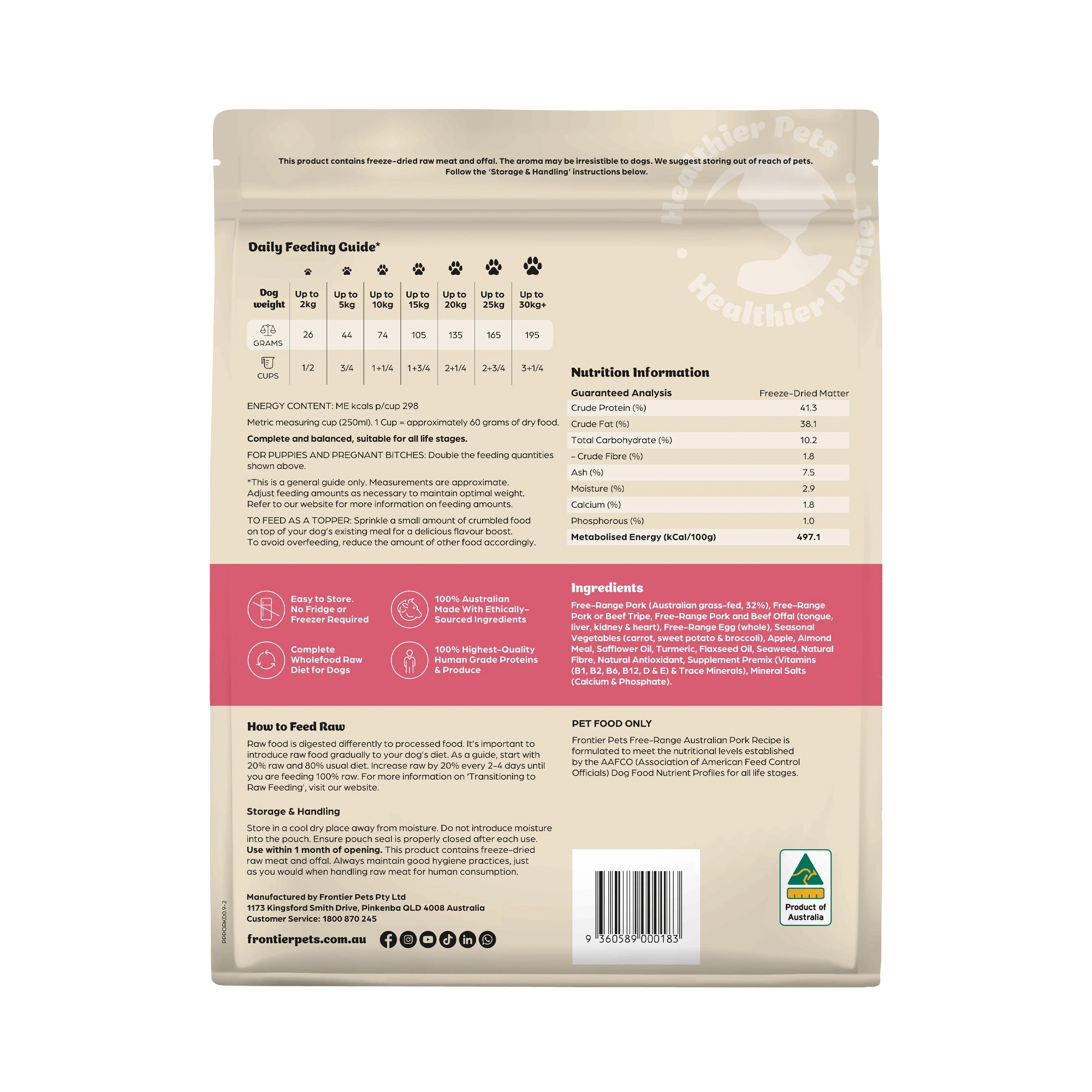 Frontier Pets Free-Range Pork Raw Freeze-Dried Adult Dog Food is freeze-dried so that the colours, flavours, smells and nutritional content remain intact.